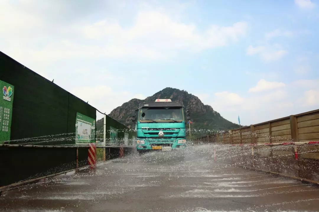 該項目除按照相關要求安裝自動汽車沖洗平臺、便道兩側設置環場噴淋、出入口安裝24小時揚塵在線監測和視頻監控設備外,還組織了各參建單位技術力量,創新開發了不停車沖洗設施作為輔助標準化洗車平臺,以加強沖洗效果。出入口設置凈車檢查點,對沖洗不徹底的部位,采用手持高壓水槍進行徹底清洗。目前項目的各出入口均已配置2臺自動汽車沖洗平臺,2臺高壓水槍和不停車沖洗設施。通過以上措施,實現施工范圍內揚塵情況24小時零死角監控,確保外運車輛不帶泥上路。
