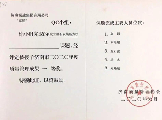 經(jīng)濟(jì)南質(zhì)量管理協(xié)會(huì)專家組評審,濟(jì)南城建集團(tuán)有限公司報(bào)送的QC成果榮獲一等獎(jiǎng)5項(xiàng)、二等獎(jiǎng)4項(xiàng),濟(jì)南城建集團(tuán)有限公司的城市隧道項(xiàng)目班組、701項(xiàng)目班組、盾構(gòu)施工管理班組、804項(xiàng)目班組等共有7個(gè)班組榮獲“2020年度濟(jì)南市質(zhì)量信得過班組”稱號。另外,張勝安等3名員工獲得“2020年度濟(jì)南市優(yōu)秀質(zhì)量管理先進(jìn)工作者”稱號。