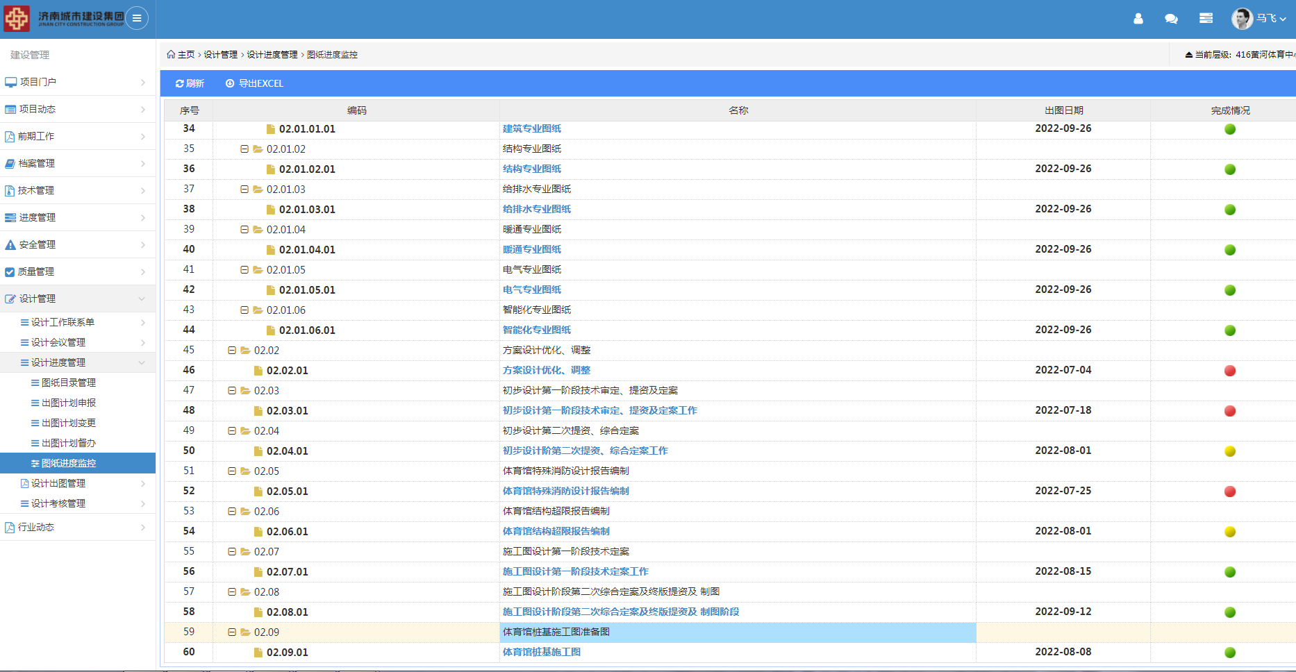 為進一步強化設計源頭管理,克服設計過程環(huán)節(jié)多、線下管控難度較大的實際,工程四部OA信息平臺開發(fā)研制設計管理業(yè)務功能模塊并在黃河體育中心項目全面應用。通過設計管理業(yè)務功能模塊,實現出圖計劃、圖紙上傳、分發(fā)簽收、圖紙會審、變更、圖紙文檔的統一編碼與存檔,有效提升設計管理中工作任務安排、接收及出圖計劃整體把控。