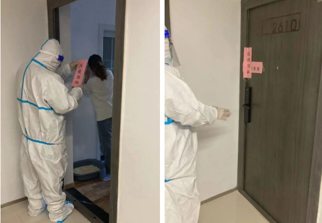 當柏然公館項目收到業主需要居家隔離的通知,福仁服務人員身穿防護服,上門耐心溝通安撫,“遇到事情需要代辦的,東西需要代買的,隨時打電話找我們!我們24小時為你開機!”