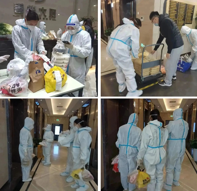 因項目臨時封控,為防止業主上下樓層增加交叉感染的可能性,善能大廈福仁服務全體員工全副武裝,統一為業主配送餐食,保障業主的正常就餐,讓業主吃好、吃飽,緩解因封控帶來的情緒壓力。等他們忙碌完送餐的工作,又要投入到其他防疫工作中去,常常一天下來也無法保證吃上一頓飯,可她們卻微笑著說:“忙下來也不覺得餓,能讓業主安心,及時吃上熱乎飯,我們就放心了……”