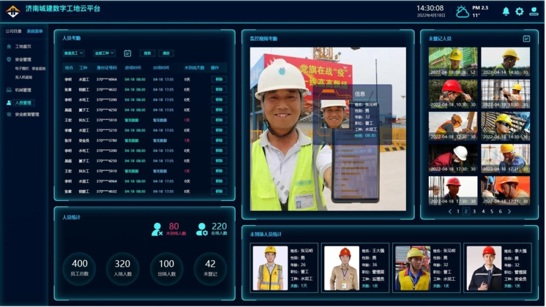 人員管理實現(xiàn)優(yōu)化,G104京嵐線濟(jì)南黃河公路大橋擴(kuò)建工程項目應(yīng)用智能化勞務(wù)人員管理系統(tǒng),系統(tǒng)根據(jù)視頻采樣,可以實時定位,統(tǒng)計當(dāng)日出勤人數(shù),能夠針對不系安全帶、不正確佩戴安全防護(hù)用品,違章動火作業(yè)等進(jìn)行智能識別,并抓拍報警。系統(tǒng)累計保障工地安全620天,累計錄入工人800余人,攝像頭安裝17個,避免了火災(zāi),機(jī)械違規(guī)載人,安全用品佩戴不規(guī)范,防護(hù)缺失等隱患發(fā)生。