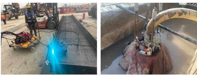 航天大道穿黃隧道工程(I期)包括隧道東岸始發(fā)井及明挖段圍護(hù)結(jié)構(gòu)采用地連墻+內(nèi)支撐形式,共計(jì)地連墻87幅,使用工字鋼3578米。項(xiàng)目部精心策劃,通過方案比選,確定使用焊接機(jī)器人進(jìn)行施工,較傳統(tǒng)人工焊接工效提升3倍,費(fèi)用降低93%。