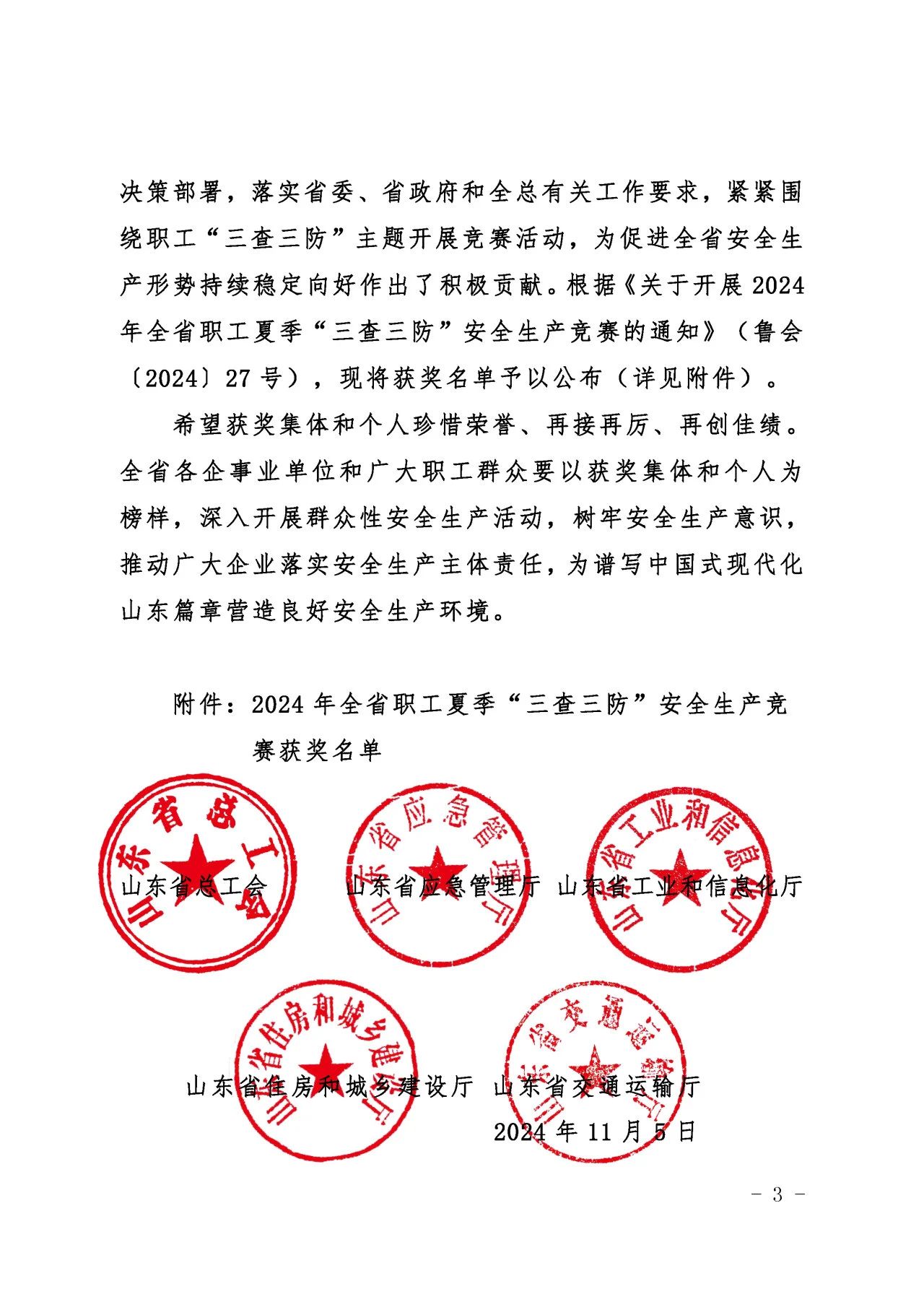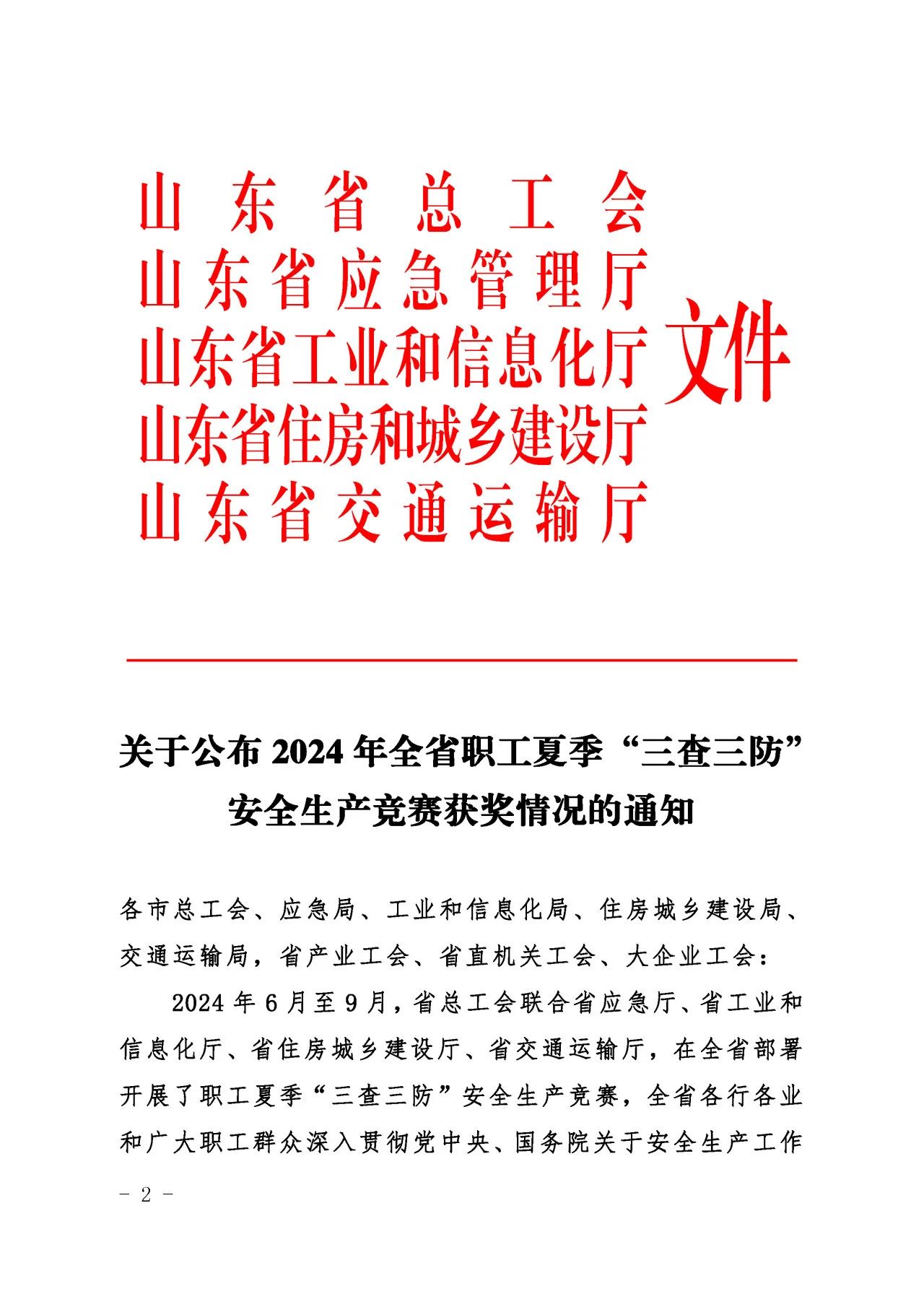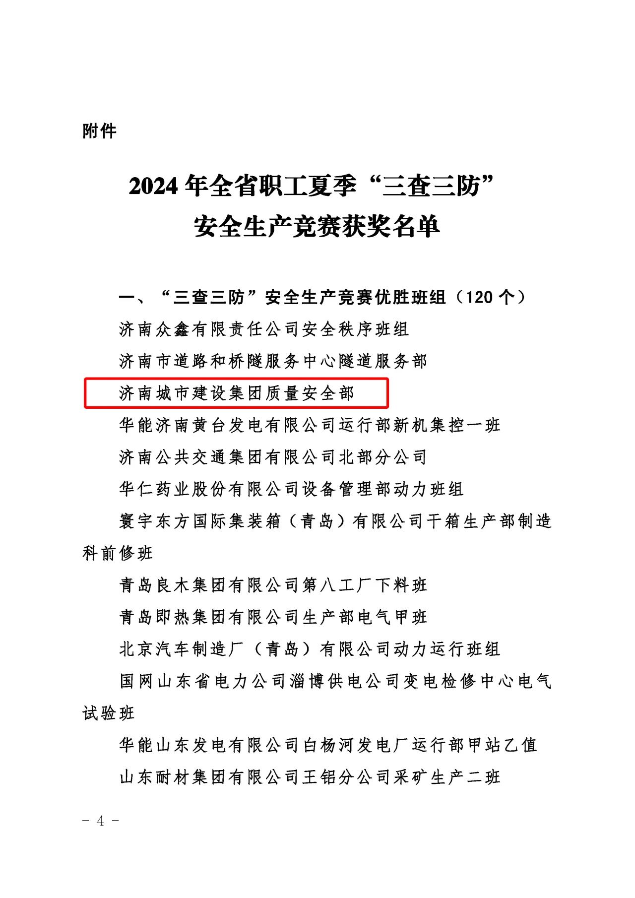近日,山東省總工會、山東省應(yīng)急管理廳、山東省工業(yè)和信息化廳、山東省住房和城鄉(xiāng)建設(shè)廳、山東省交通運(yùn)輸廳聯(lián)合發(fā)布了《關(guān)于公布2024年全省職工夏季“三查三防”安全生產(chǎn)競賽獲獎(jiǎng)情況的通知》,濟(jì)南城市建設(shè)集團(tuán)質(zhì)量安全部積極響應(yīng)上級主管部門的號召,按照集團(tuán)黨委的科學(xué)部署,全面而深入地開展了各項(xiàng)安全專題活動(dòng),榮獲“三查三防”安全生產(chǎn)競賽優(yōu)勝班組榮譽(yù)稱號。